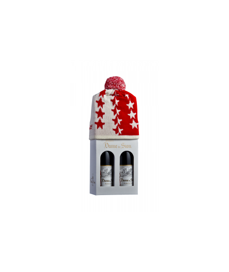 Ce coffret se compose de 2 bouteilles de Fendant La Dame de Sion ainsi qu'un bonnet Valaisan