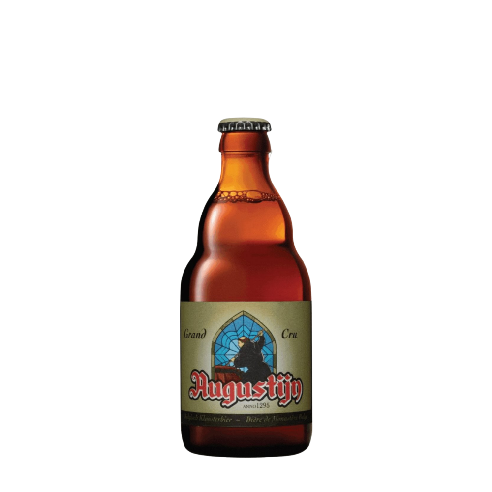 Découvre Augustijn Grand Cru, une bière de monastère à la robe or pâle légèrement brumeuse, surmontée d’une mousse blanche fine, symbole de finesse et de qualité.